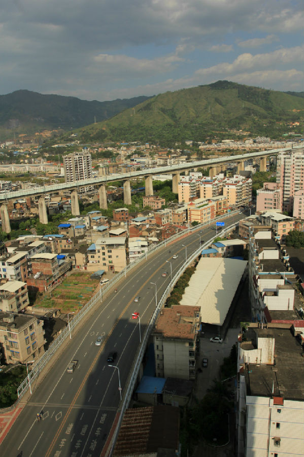 龍巖市東興高架橋位于龍巖市中心城區(qū)東北部,總投資9926萬元, 城市主干道Ⅱ級,為東興路東風橋至南環(huán)路段,該路段長約740米,屬城市內環(huán)線,車流量大,沿線與登高東路、鐵路、棋盤路及南環(huán)路相交,與鐵路平交處該路段高架橋上跨鐵路;在登高東路與東興路高架橋之間設置A、B、C、D匝道(均為單向單車道)利用4條匝道將既有登高東路與東興路相連,從而在東興路與登高路之間形成半苜蓿葉型互通式立交。高架橋全長461.77米,沿線與登高東路、漳龍鐵路、棋盤路及支小路相交,本工程采用高架上跨形式,跨越相交道路與鐵路,完全解決了與鐵路平交的安全隱患。橋梁上部結構采用(18.5+20+20)m普通鋼筋砼連續(xù)梁及25m、30m預應力砼空心板梁,橋面連續(xù),下部采用樁接立柱接蓋梁橋墩與U型橋臺,墩臺基礎采用鉆孔灌注樁基礎。